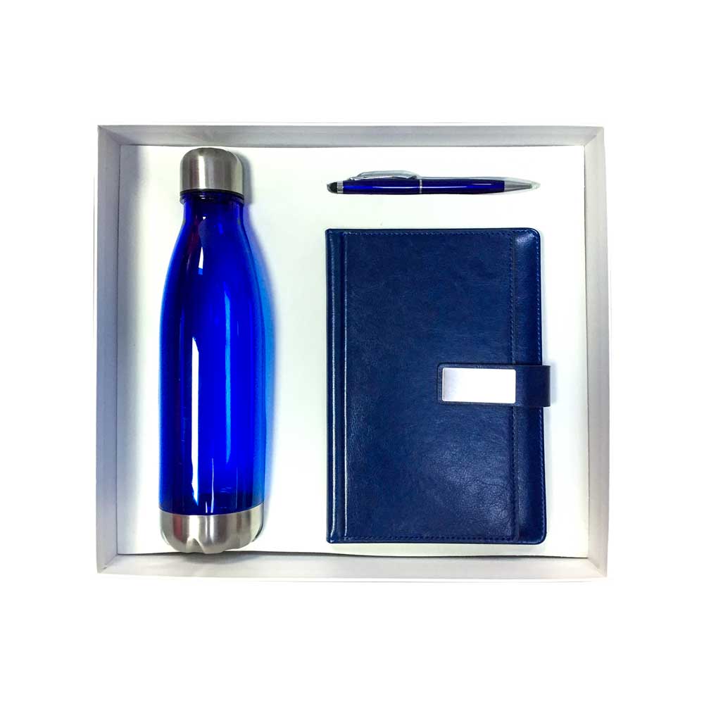 Set Includes: Plastic Bottle, PU Leather Notebook & Metal Pen Packaging: Large White Gift Box with Sleeve Printing Options: Laser Engraving, Screen Printing & UV Printing